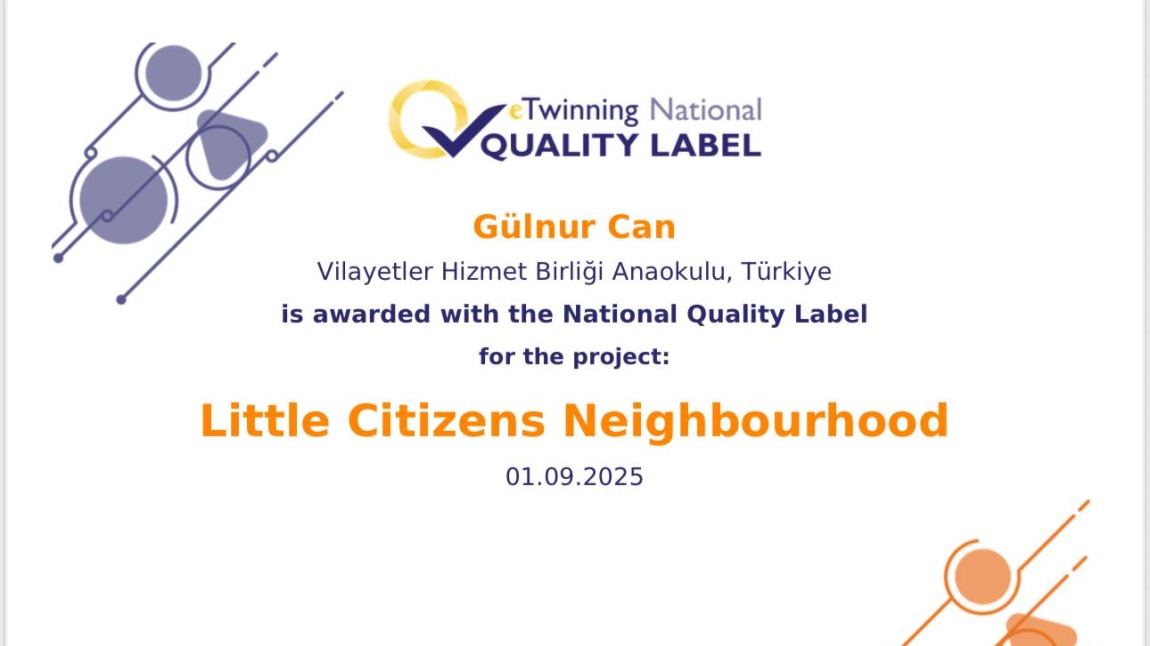 Küçük Vatandaşlar Mahallesi e Twinnig projesi kalite etiketi alan öğretmenimiz Gülnur CAN ı tebrik ederiz.